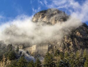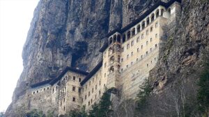 Sümela manastırı Trabzon’un Maçka İlçesi’nin Altındere Köyü sınırları içinde, Altındere vadisine hakim Karadağ’ın eteklerinde sarp bir kayalık üzerine kurulmuş olan Sümela Manastırı, halk arasında “Meryem Ana” adı ile anılır. Vadiden yaklaşık 300 metre yükseklikte bulunan yapı, bu konumuyla manastırların şehir dışında, ormanlarda, mağara ve su kenarlarında kurulma geleneğini sürdürmüştür.